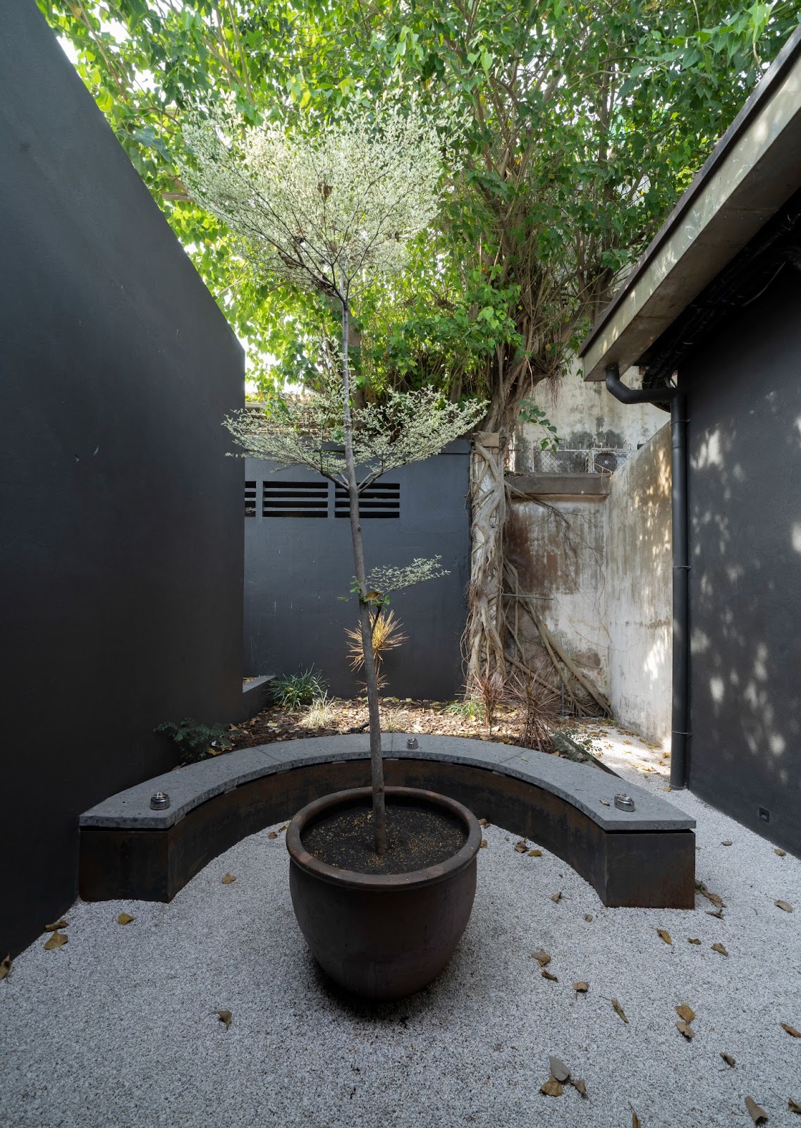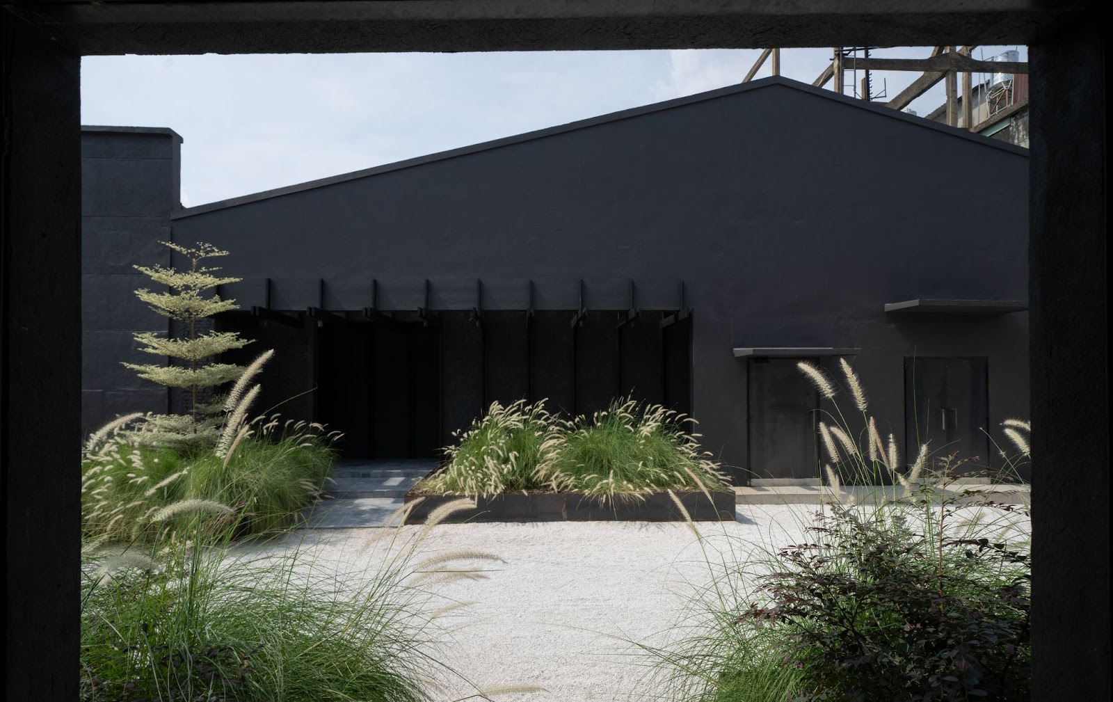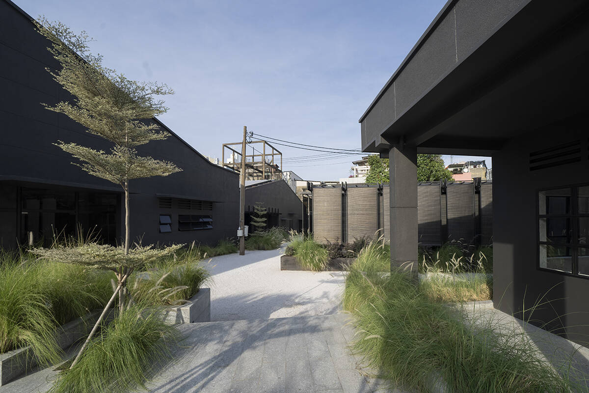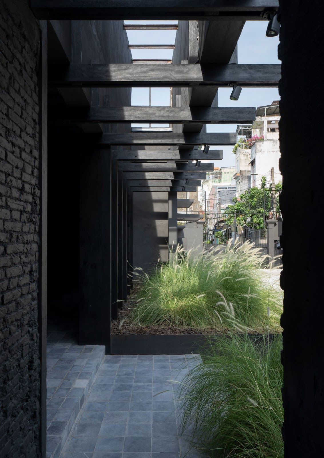 Không gian tiếp cận bắt đầu từ một con hẻm đặc trưng của Sài Gòn, mở ra khoảng lùi râm mát trước khi dẫn vào khuôn viên chính. Từng thay đổi nhỏ về tỷ lệ, ánh sáng và chất liệu đều được cân nhắc kỹ nhằm tạo cảm giác chuyển tiếp tự nhiên, thay vì tương phản đột ngột. Các khối kiến trúc hiện rõ với tông xám than nổi bật trên nền đá sáng và cây xanh bản địa, tạo nên lớp biểu đạt vật chất nhưng vẫn giữ chất tĩnh.