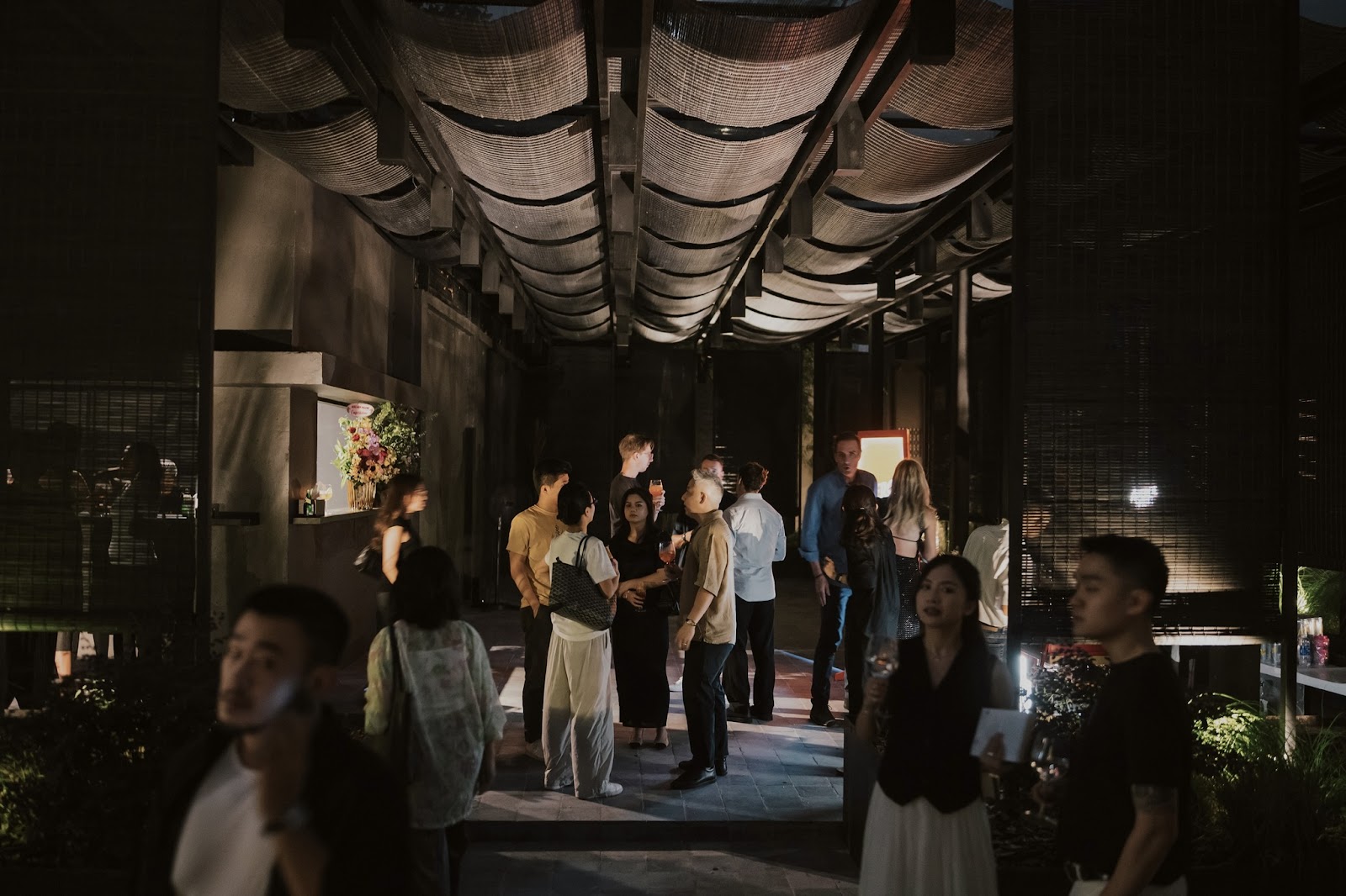 Lấy cảm hứng từ sân trong truyền thống kiểu Việt, không gian sự kiện ngoài trời được tổ chức với bố cục mở, biên độ linh hoạt, tận dụng thông gió tự nhiên. Tại đây, vật liệu vừa đóng vai trò cấu trúc, vừa góp phần tạo nên cảm xúc không gian. Rèm tre, vách vải bố và gỗ cũ chuyển động nhẹ theo gió, mang lại cảm giác mềm mại, thông thoáng và gần gũi. Chúng không chỉ đảm nhiệm chức năng che nắng hay phân chia không gian, mà còn giúp kết nối con người với môi trường xung quanh một cách tự nhiên và tinh tế.