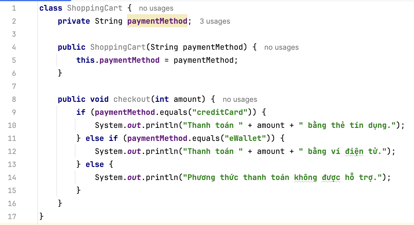 Trong phương án này, lớp ShoppingCart phải xử lý tất cả các điều kiện thanh toán khác nhau bằng cách sử dụng các khối if-else. Cách này dẫn đến mã phức tạp và không dễ mở rộng.