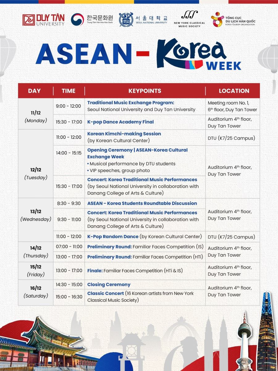 Hãy cùng đến với hành trình đầy trải nghiệm của Tuần Lễ Giao Lưu Văn Hóa ASEAN - KOREA tại Đại học Duy Tân! Trong suốt tuần lễ 11-16/12/2023, chúng mình sẽ được chìm đắm trong không khí hân hoan của các sự kiện độc đáo và thú vị. Cập nhật ngay lịch trình sự kiện hấp dẫn mà chúng ta không nên bỏ lỡ: