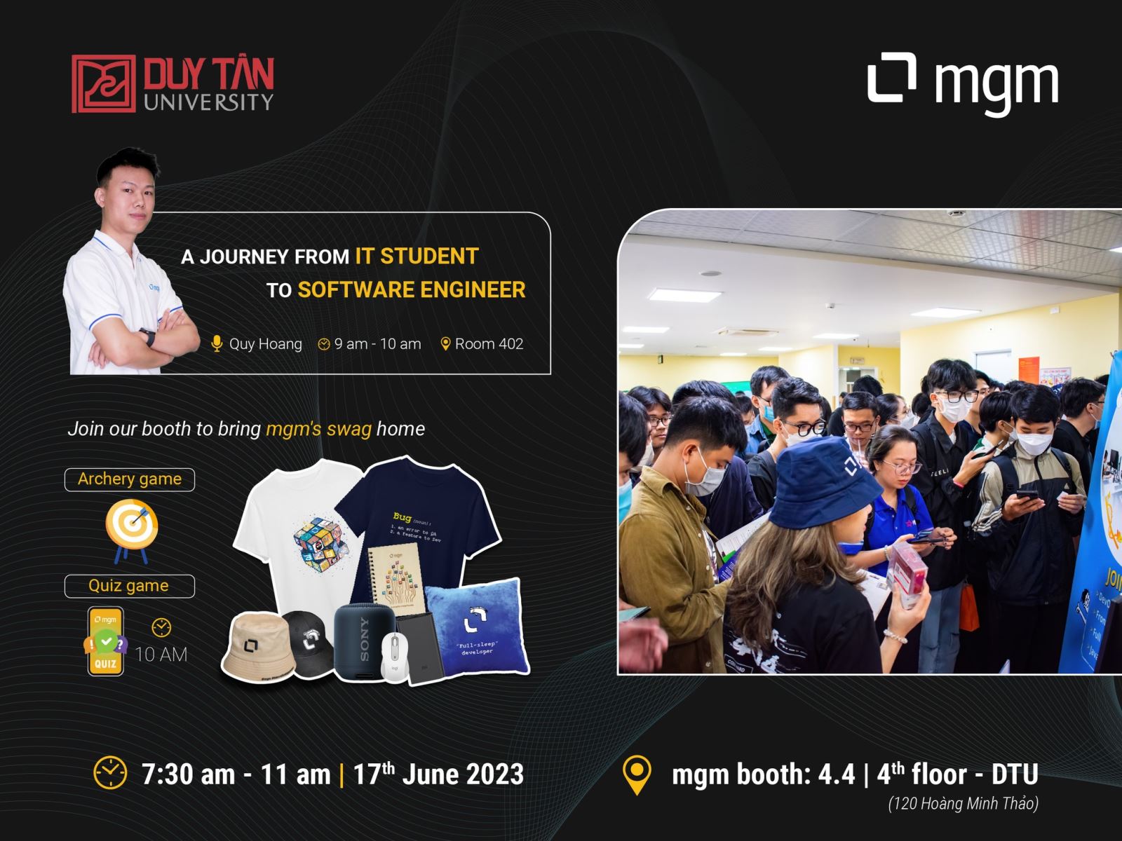 Đầu tiên chính là diễn giả Quý Hoàng, đến từ MGM, cũng là cựu Sinh viên ITCMU với "Hành trình từ Sinh viên IT đến Kỹ sư phần mềm". Hãy đến với gian hàng 4.4 của MGM ngày 17/6 để giao lưu và nhận các phần quà cực chất nhé!