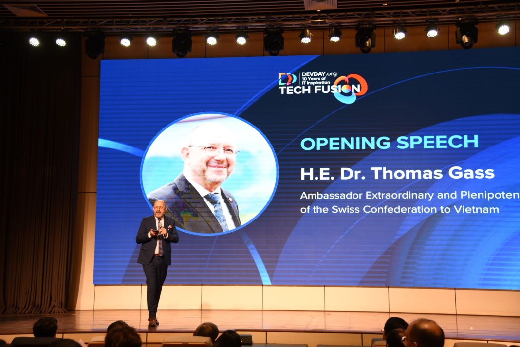 Trong phiên khai mạc sáng ngày 12/4/2025, Đại sứ đặc mệnh toàn quyền Liên bang Thụy Sỹ tại Việt Nam Thomas Gass, đã có những chia sẻ sâu sắc và truyền cảm hứng về một tương lai “Tech Fusion”, để kiến tạo và làm nên các giải pháp kết nối mới, nâng cao hơn chất lượng cuộc sống. Trong nhiệm kỳ của mình, đây là lần đầu tiên, Ngài Thomas Gass đến với Đà Nẵng thông qua nhịp cầu DevDay.