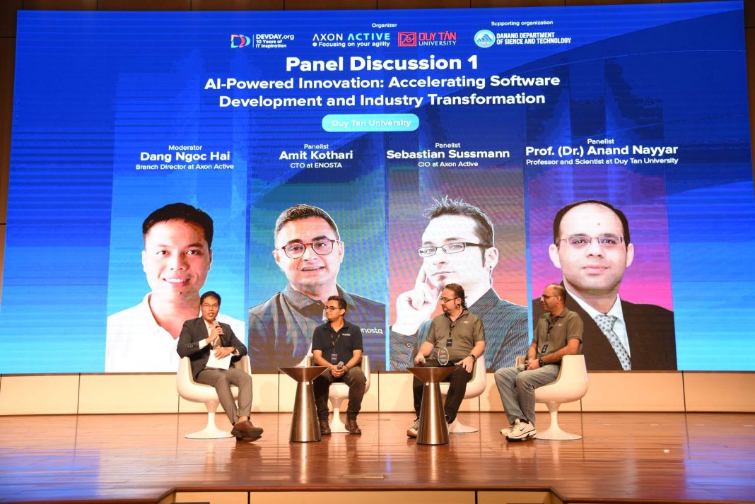 Chuyên đề 1:. Điều phối: Anh Đặng Ngọc Hải – (Điều phối viên, người đầu tiên bên trái) cùng các diễn giả: GS.TS Anand Nayyar – Nhà khoa học tại Đại học Duy Tân, Amit Kothari – CTO tại ENOSTA, Sebastian Sussmann – CIO tại Axon Active Việt Nam trong phiên thảo luận chuyên đề 1: Đổi mới với Trí tuệ Nhân tạo – Thúc đẩy phát triển phần mềm và chuyển đổi ngành công nghiệp. Ảnh: T.Ngọc.